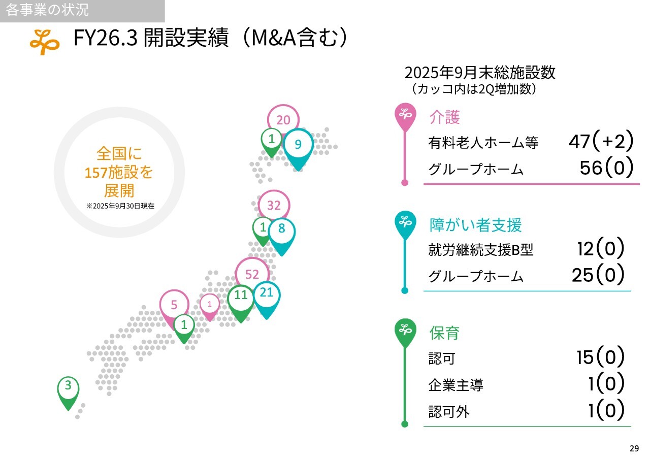 開設実績についてです。第2四半期は大きく伸びていないものの、第1四半期にM&Aで取得したグループホームを含め、今期は一定の成長を図れると考えています。