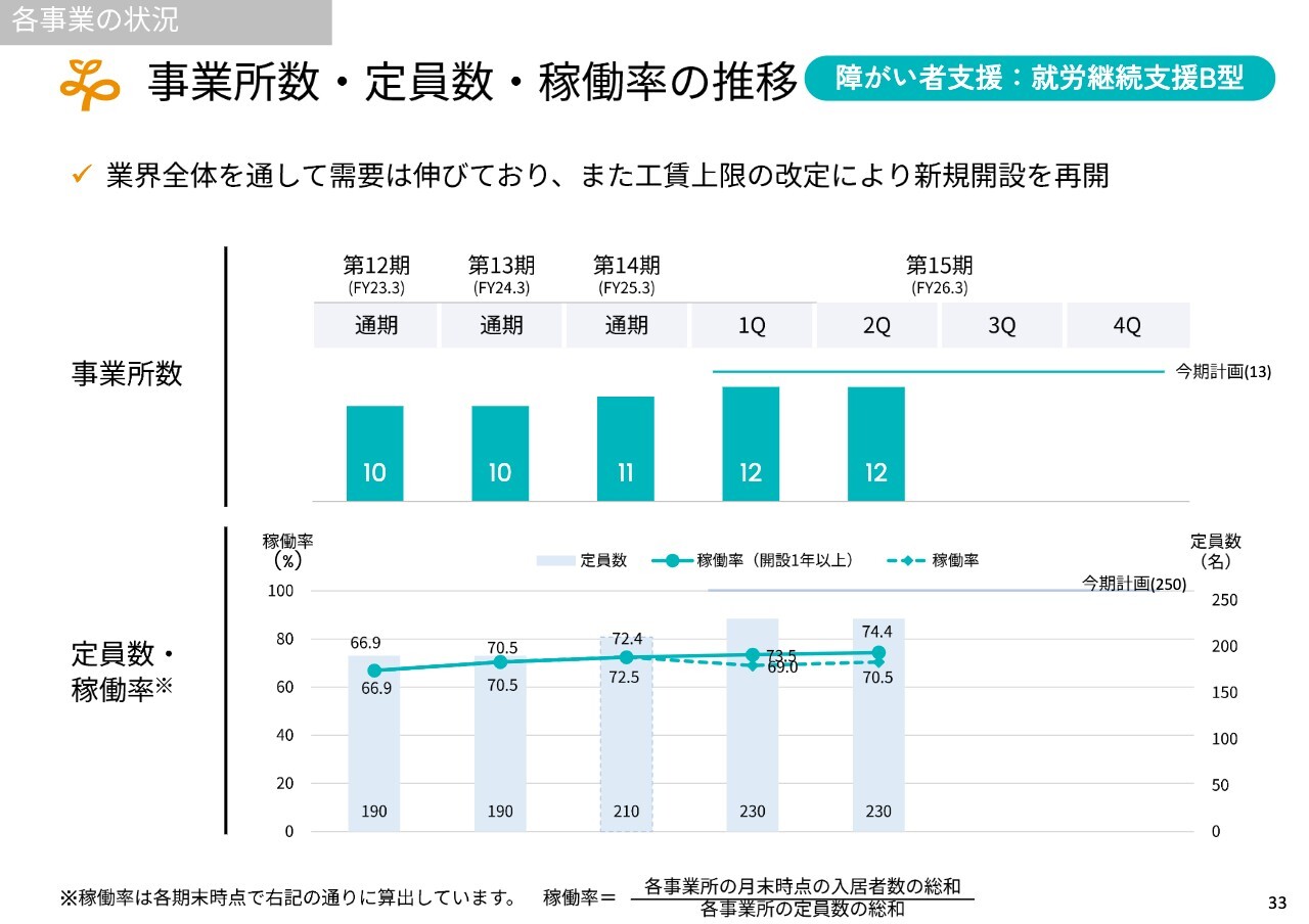 障がい者支援事業は、大きく分けて就労継続支援B型とグループホームがあります。就労継続支援B型については、前回の改定によりある程度事業性が高まったため、開設を増やしている状況です。また、さまざまな運営改革により、今後稼働率が増加すると考えていますので、期待していただければと思います。