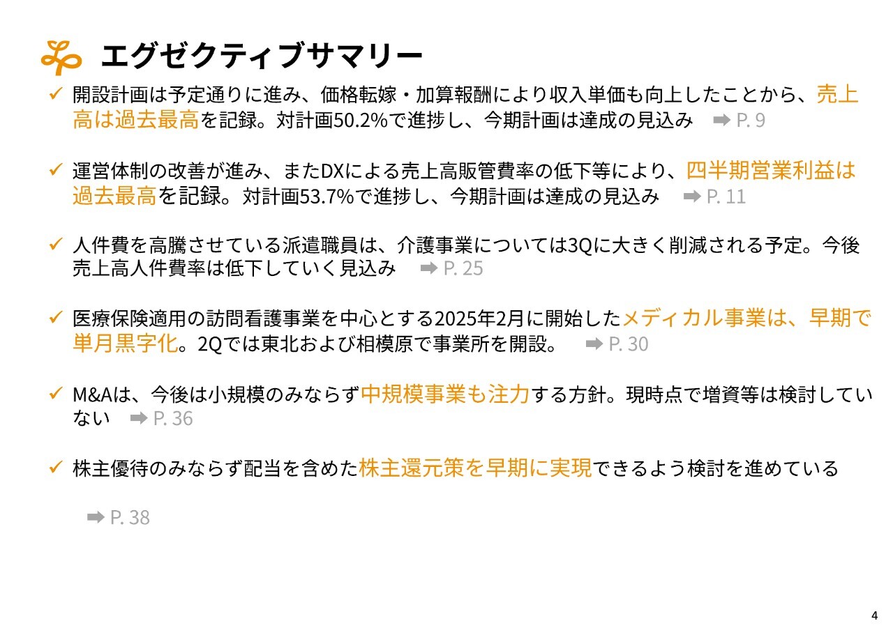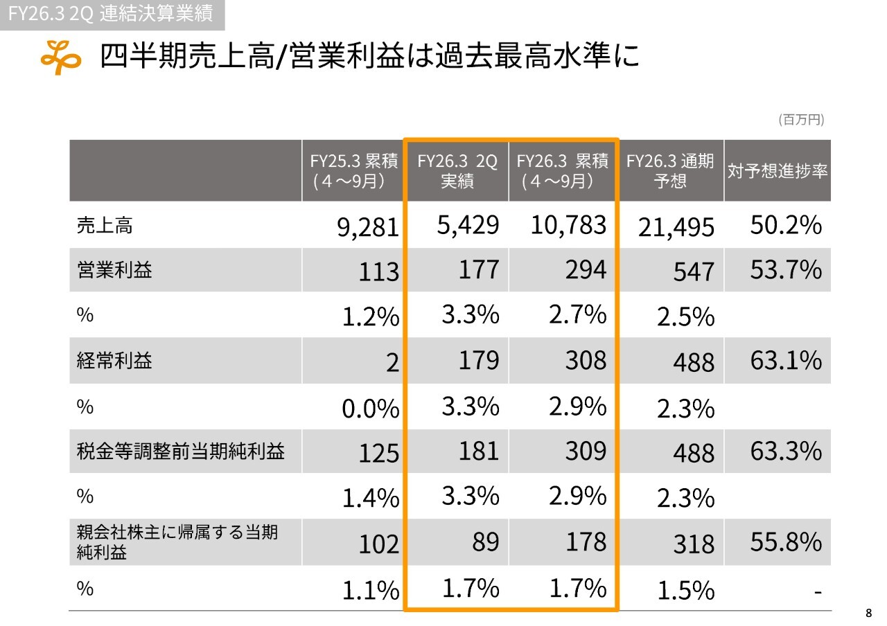 全体として、第2四半期において売上高と営業利益が過去最高を記録しました。また、中規模のM&Aを含め今後注力することを検討しており、さらに株主優待や配当を含む株主還元についても早期に実現する方向で検討しています。