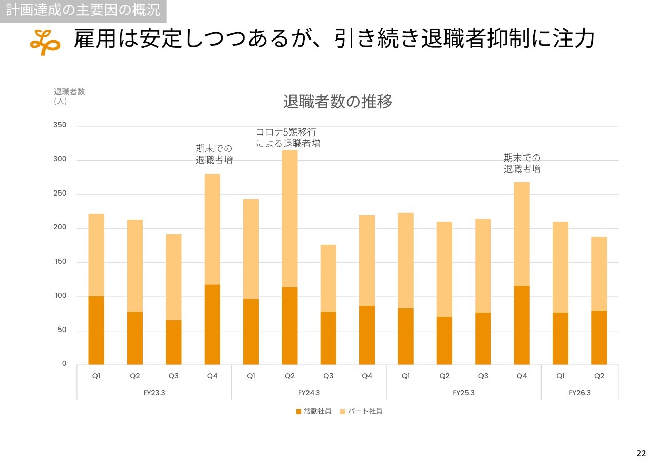 そして、入職においてはさまざまな媒体を利用する中で、当社は採用単価や応募単価、採用率、応募率ともに非常に高水準を達成しています。一方で、退職者の抑制も重要課題として捉え、さまざまな施策を実施しています。