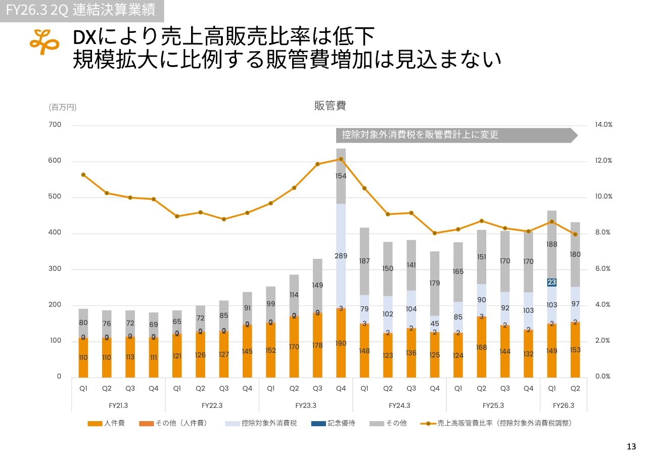売上高販管費については、今後徐々に減少すると考えています。さらにDXを推進し、規模を拡大しても費用が増加しないような体制構築を進めていますので、比較的順調に進んでいると考えています。