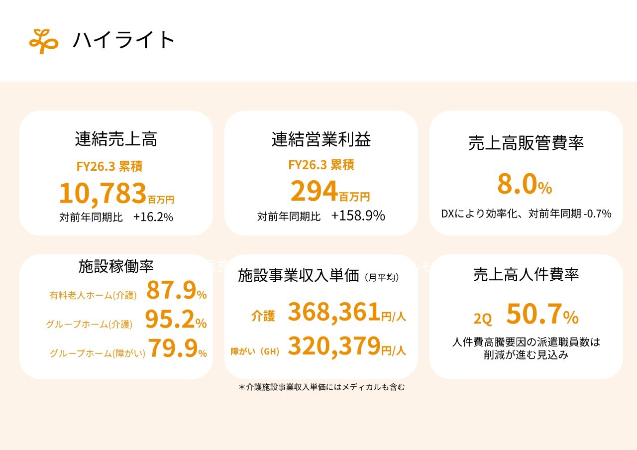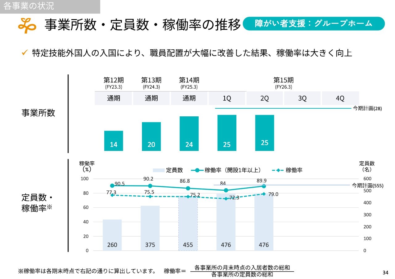 グループホームでは人員不足が深刻で、稼働率の向上が予定よりも伸びていません。ただし、先ほども触れたように、特定技能外国人を含めた新規入職の促進により、第3四半期や第4四半期で稼働率が大きく向上することを想定しており、当社としても期待しています。