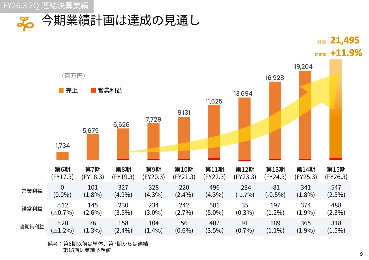 今期の業績予想については、売上高は11.9パーセントの増加を見込んでおり、現時点ではその達成が可能であると考えています。なお、今期は初めて売上高が200億円を突破する見通しです。