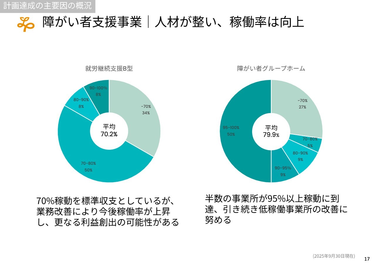 また、障がい者支援事業においても稼働率が徐々に高まっており、経営体制や幹部職員の登用も進んでいることから、今後さらに発展すると考えています。一部で開設が遅れていた事業所については、特定技能の採用を含めて下半期には進展がみられ、これにより収支が急速に改善すると考えています。