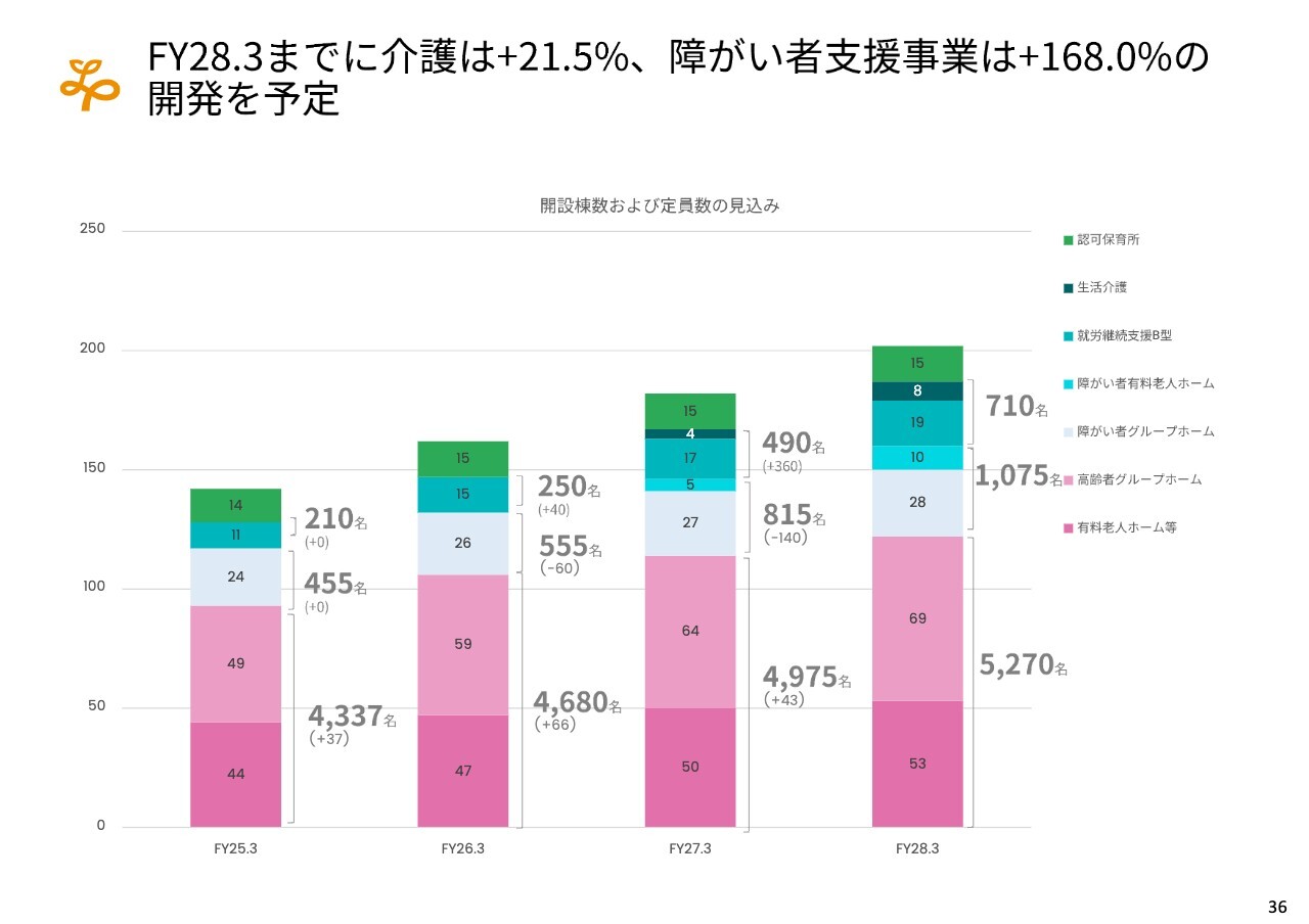 FY28.3までに介護は+21.5%、障がい者支援事業は +168.0%の開発を予定