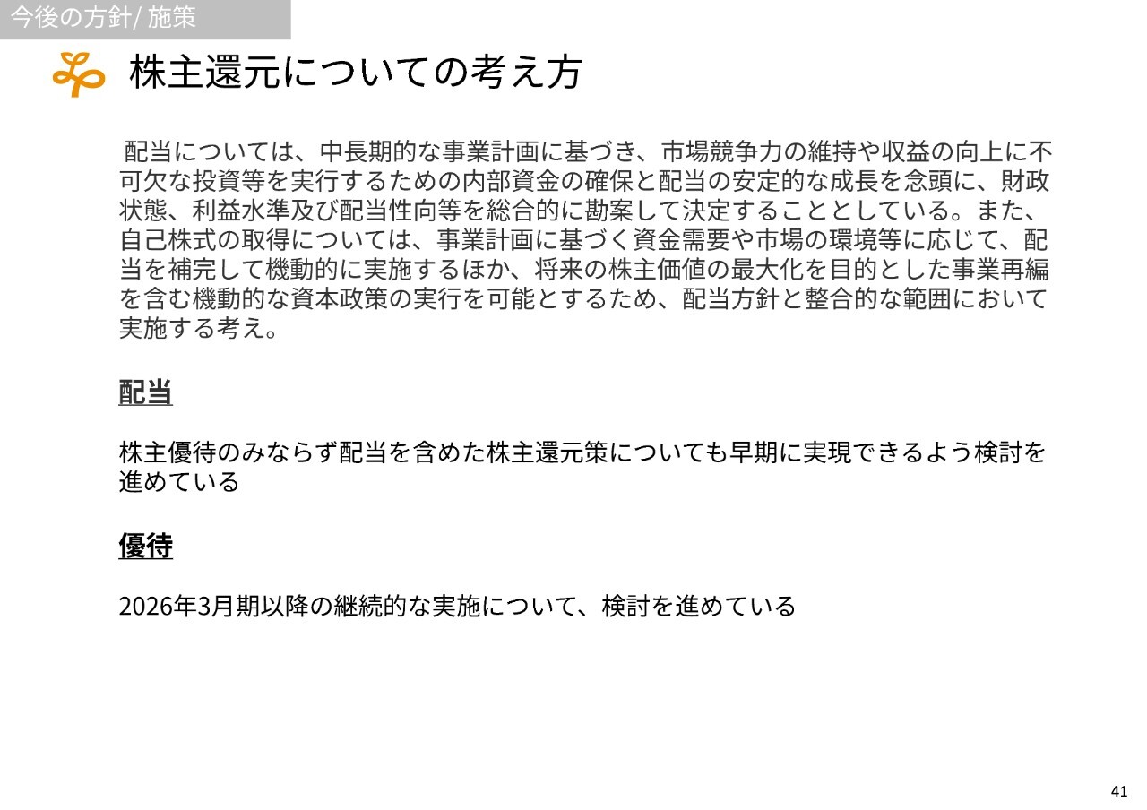 また、さまざまなかたちで株主還元を検討しており、配当を含めた組み合わせで株主のみなさまに還元していきたいと考えています。これについても、早期に実現できるよう検討を進めています。