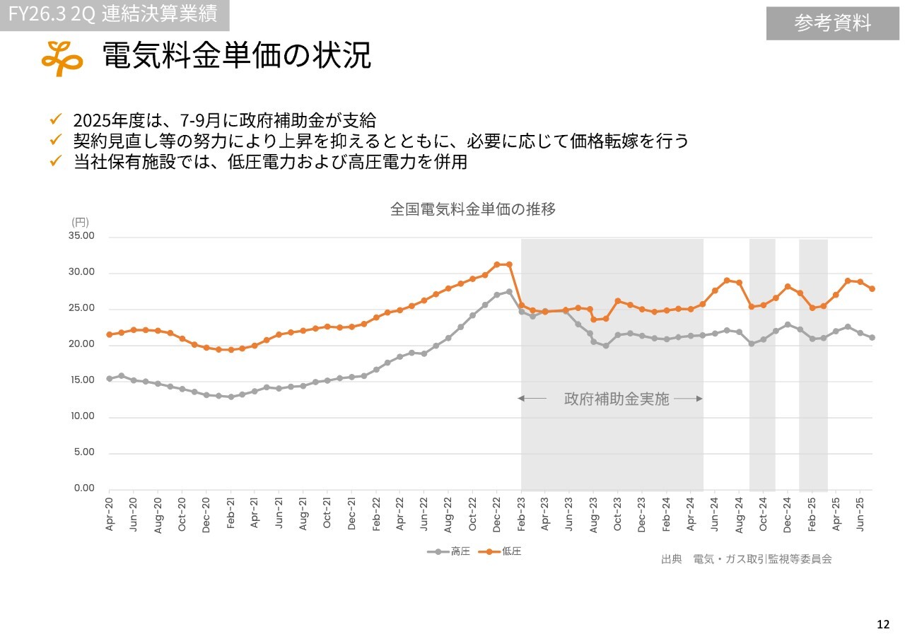 電気代は補助金の有無によって大きく変動する状況にあります。北海道に関しては、多少遅れる見込みですが、現在、泊発電所3号機の再稼働が進められています。当初は2026年度末の稼働予定と公表されていましたが、少なくとも2027年度前半には稼働すると想定しており、これにより電気代の抑制が期待されます。