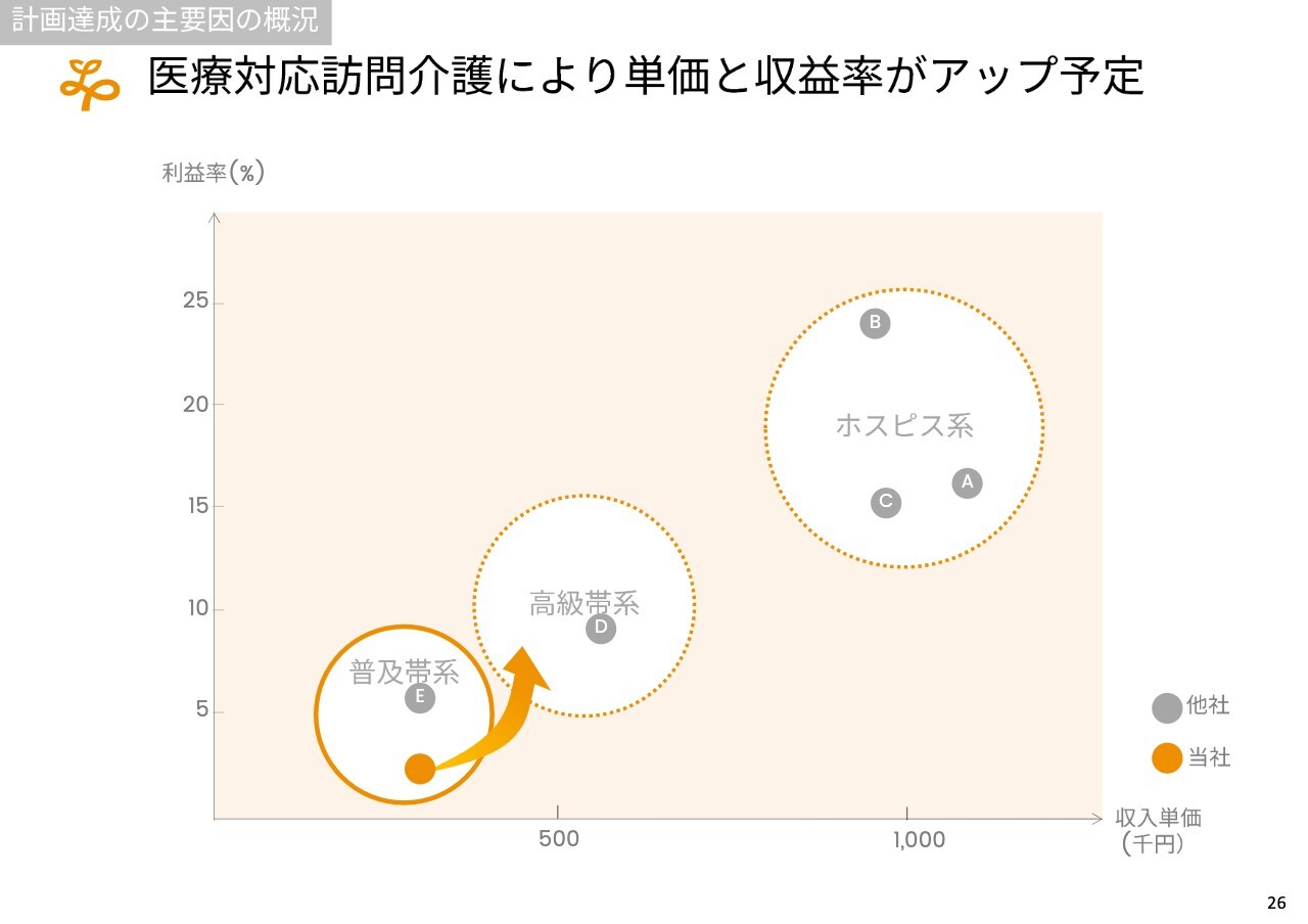 基本的な概念として、英語では「ロングタームケアシステム」といいますが、これは医療の長期・慢性期の方々を医療から介護に移すものです。そのため、もともと医療よりも単価が高いということは考えにくく、当社としてはその中間を狙っています。訪問看護の利用を進めながら、介護および障がい者支援事業の単価を引き上げることを目指しています。