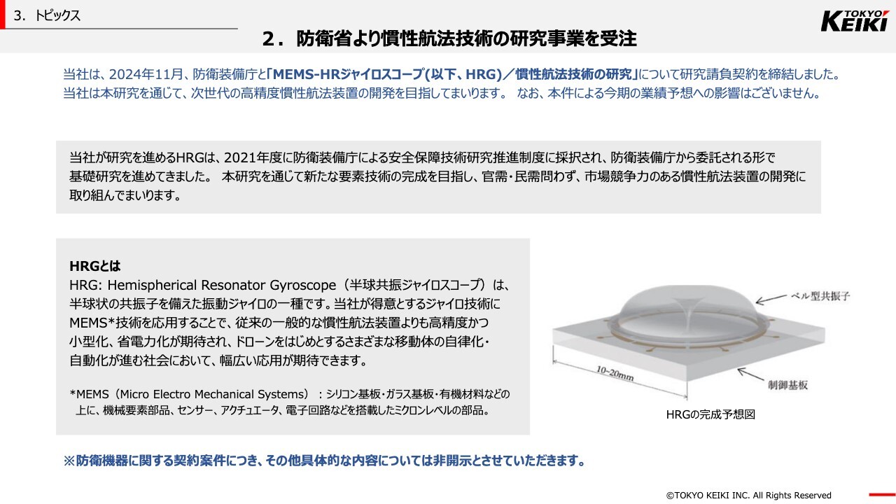 司会者:「日本の防衛予算に関して、自動輸送機や無人機の先端技術に関して予算が増額される方向かと思います。東京計器は『MEMS-HRジャイロスコープ(HRG)』の契約を発表されていますが、さらなるビジネス拡大の可能性があるのか、見通しを教えてほしいです」というご質問です。