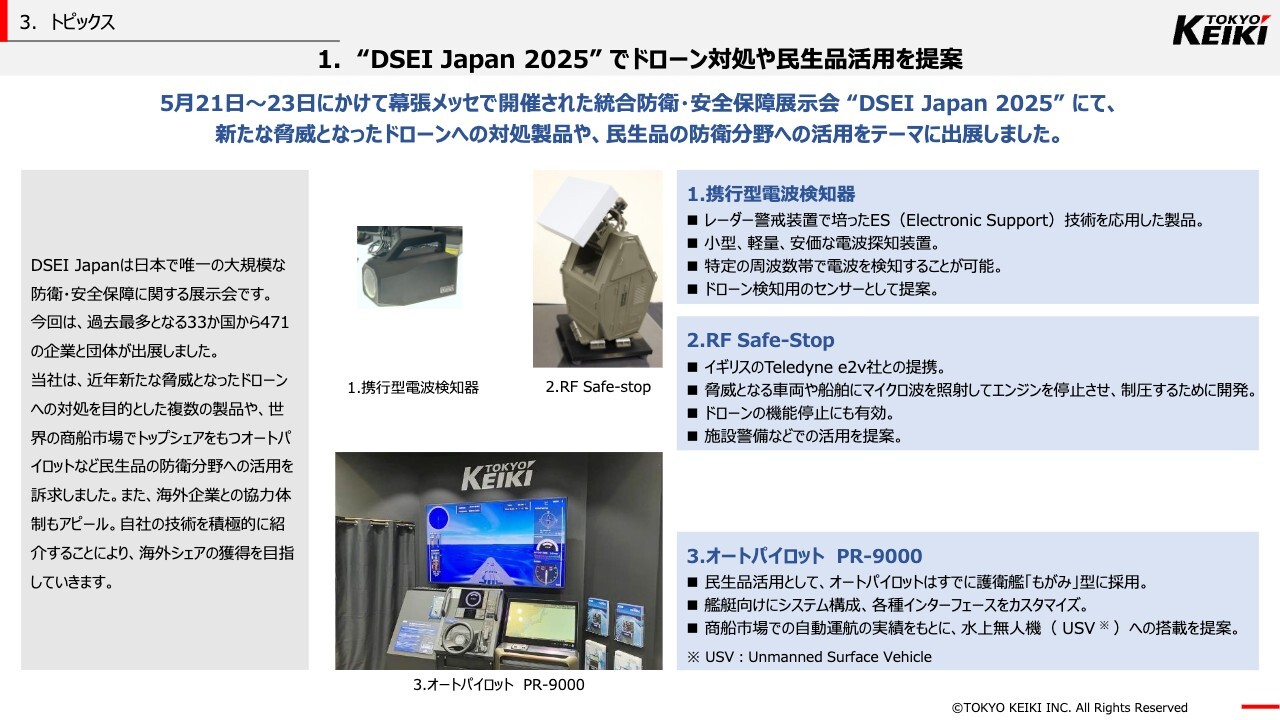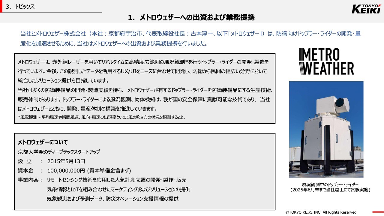 同じくドローン関連では、メトロウェザーへの出資及び業務提携を行いました。メトロウェザーは気象観測機材を製造している京都のスタートアップ企業です。この技術をドローン探知に活用できないかと協業を進めており、今後提案を進めながら、製品化を目指して取り組んでいきます。