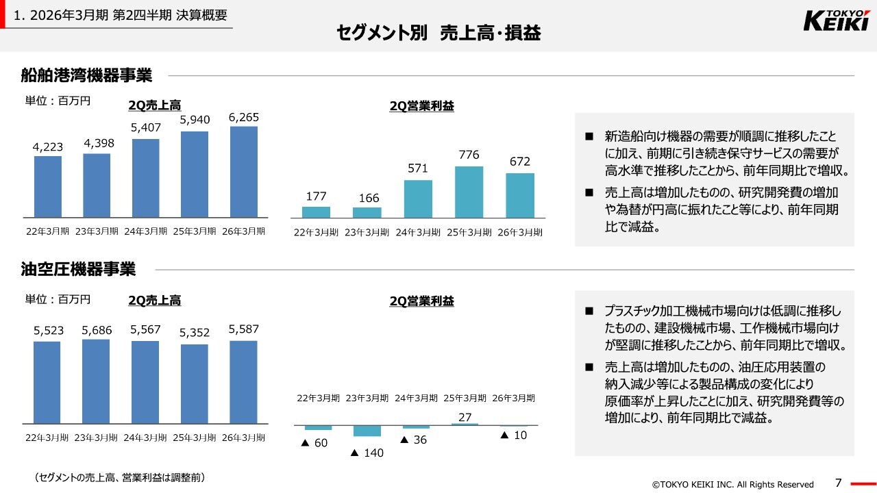一方、減益の主な要因は、製品構成の変化による原価率の上昇に加え、外観検査用として開発中のエッジAIカメラに関する研究開発費が増加したことです。ここでいう製品構成の変化とは、付加価値の高い油圧応用装置の納入が減少し、原価率の高い海外向け販売が増加したことを指します。