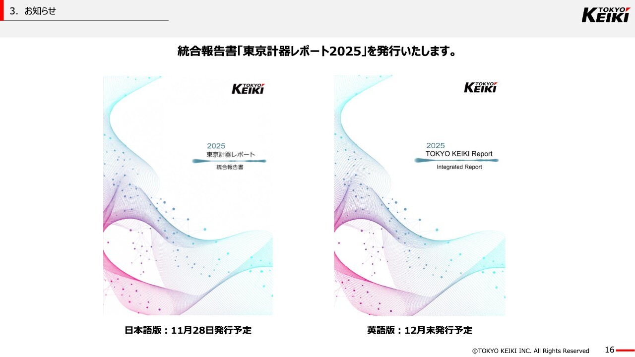 最後にお知らせです。当社は昨年度まで「サステナビリティレポート」を発行していましたが、今年度より新たに統合報告書「東京計器レポート」として発行し、当社Webサイトにて公開します。