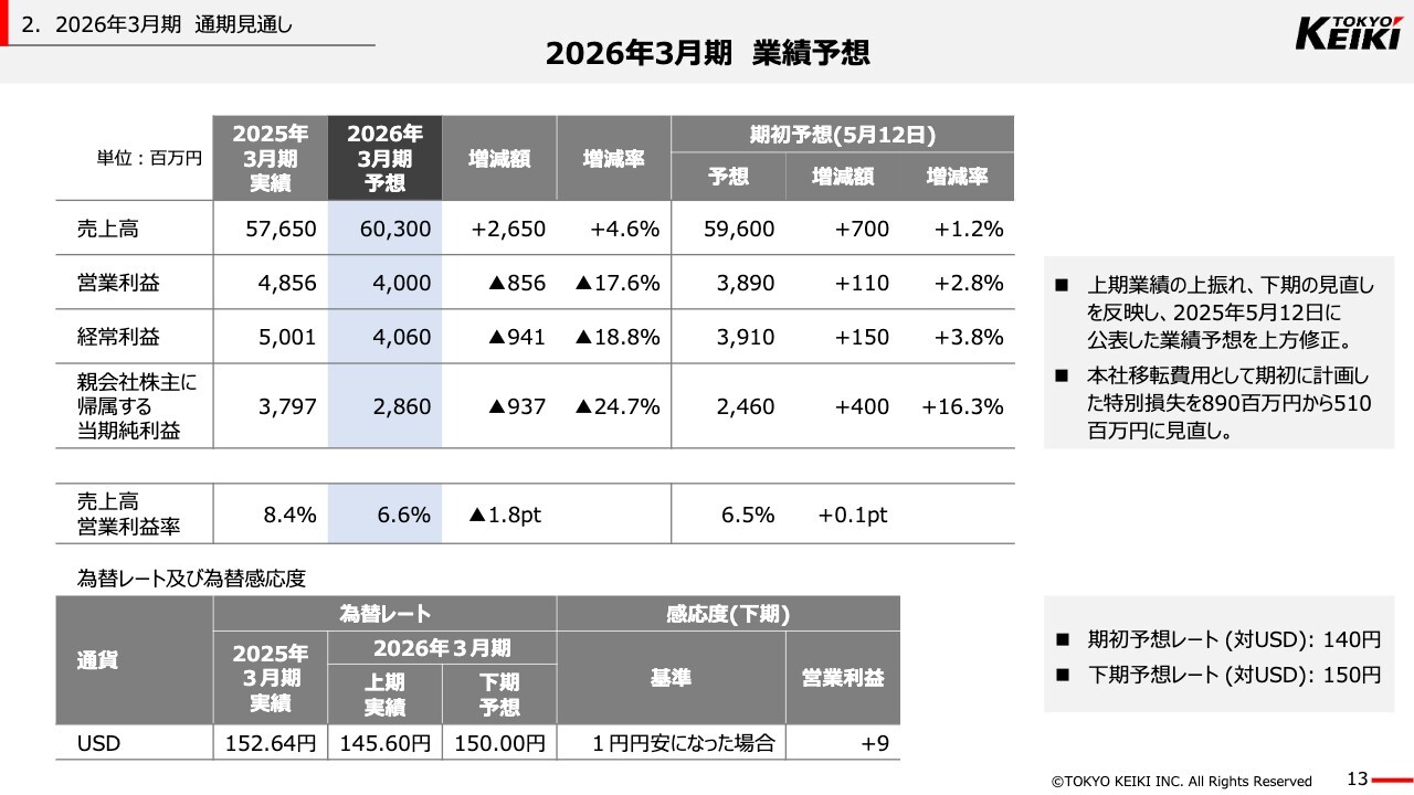 今回の通期業績見通しには、営業利益への影響額を期初計画の3億6,000万円から4億6,000万円に、特別損失への影響額を8億9,000万円から5億1,000万円に変更した内容を織り込んでいます。