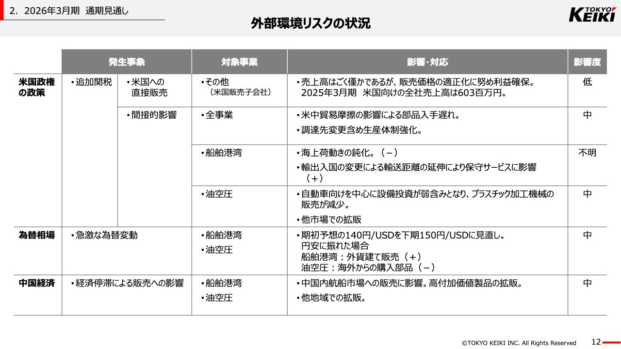 1つ目は、米国政権の政策による追加関税の間接的な影響です。これにより、油空圧機器事業においてプラスチック加工機械市場向けの販売が減少するなどの影響が出ていると認識しています。他市場への販売強化を継続していますが、期初の通期業績予想にも影響があるため、詳細は後ほどセグメント別の業績予想でご説明します。