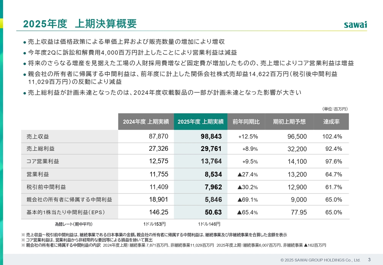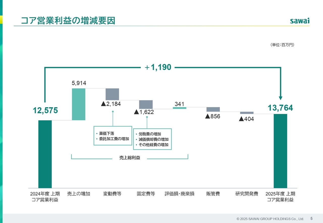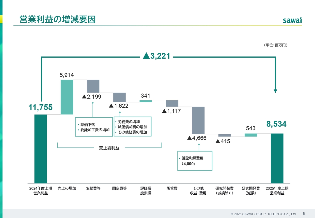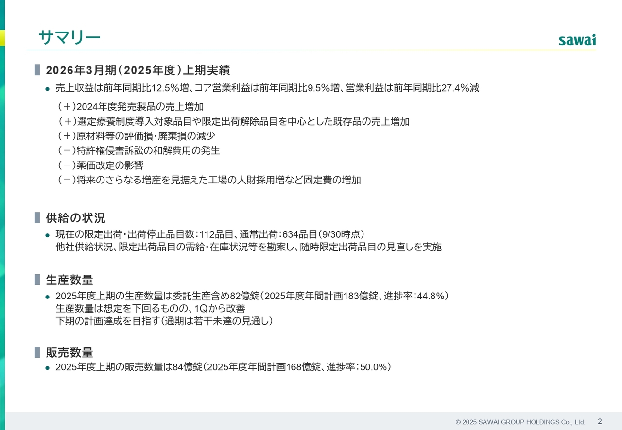 【QAあり】サワイグループHD、既存品が伸長し、売上収益が増加も訴訟の和解費用計上等により減益 生産面の改善を続け、下期の期初予想達成を目指す