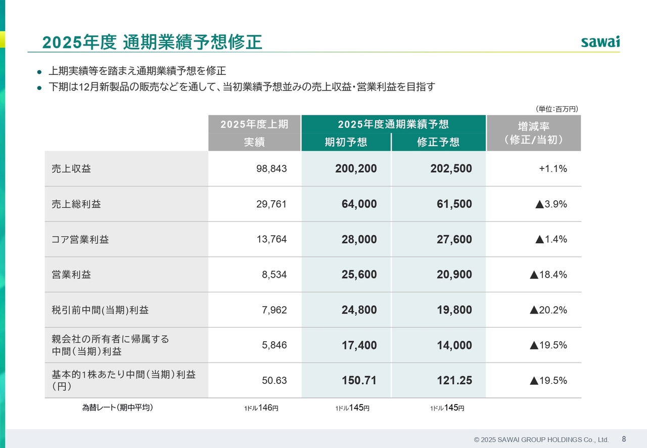 2025年度の通期業績予想の修正についてです。2025年度上期の実績を踏まえ、通期の業績予想を修正しました。なお、下期業績については期初計画を据え置いています。