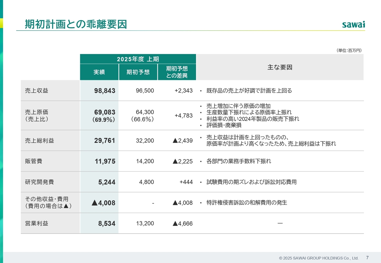 2025年上期の実績と期初計画を比較し、主な差異について記載しています。売上原価は、売上が好調であったことや生産数量の下振れに伴う原価率の上昇が差異の原因です。全体として、売上総利益の下振れは販管費の下振れでおおよそ相殺できていますが、和解費用の発生により営業利益が期初計画から乖離しています。