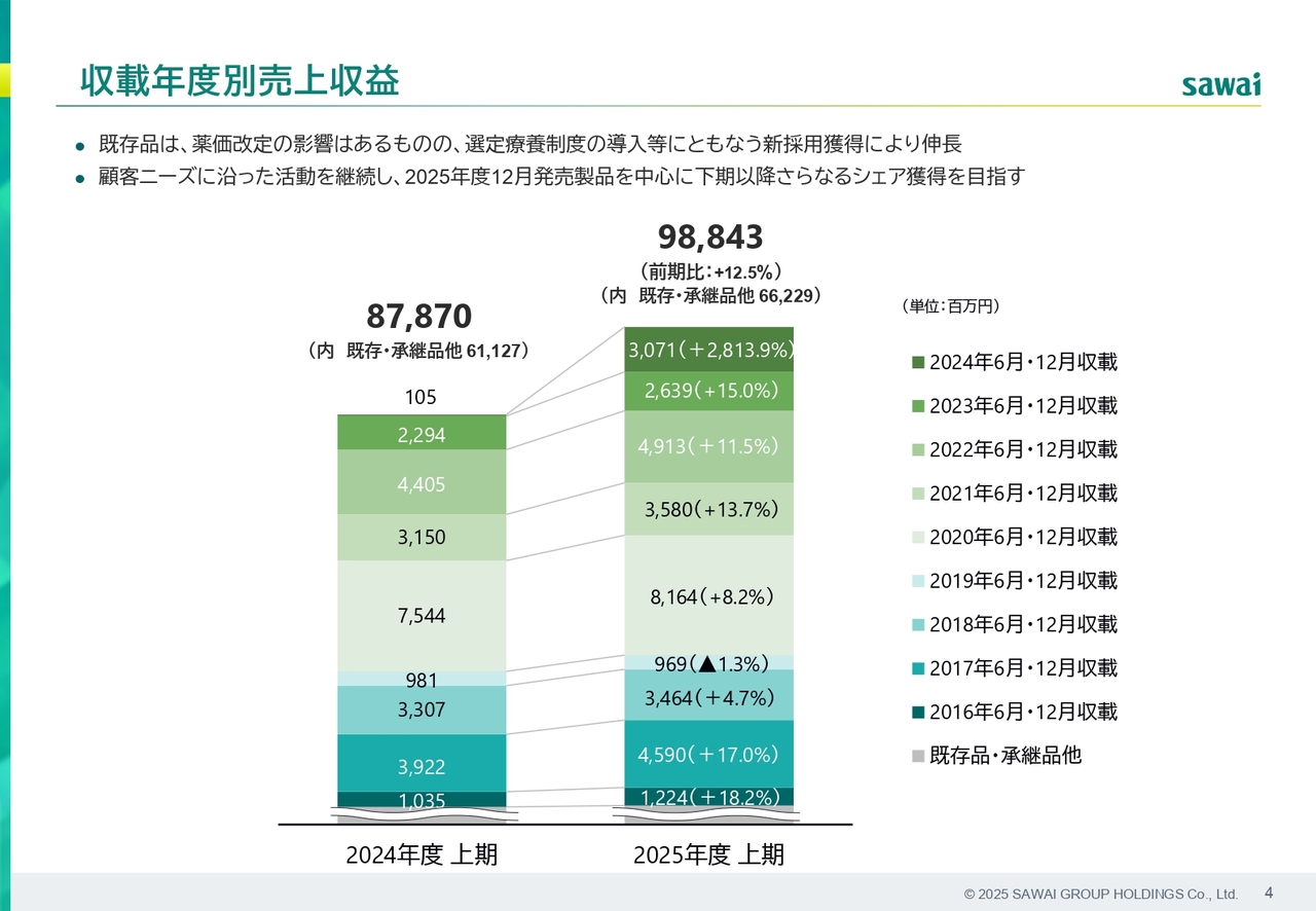 収載年度別の売上収益の概要です。選定療養制度の効果により、既存品の売上が増加しています。今後は、2025年12月に発売予定の新製品でのシェア獲得を目指します。