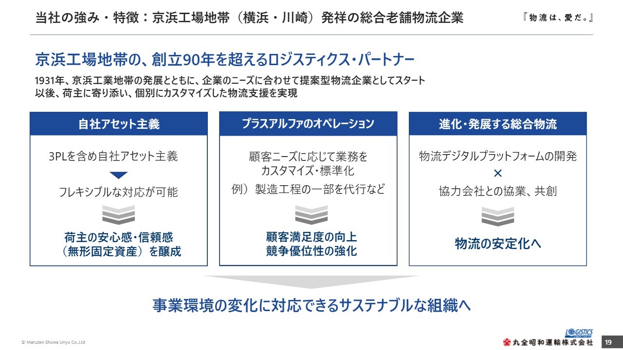 当社の物流事業者としての強みは、京浜工業地帯とともに発展し、長年培われてきた業務ノウハウによる高品質な物流サービスの提供にあります。荷主現場を支える物流事業を展開し、荷主に寄り添いながら関係基盤を構築・強化してきました。