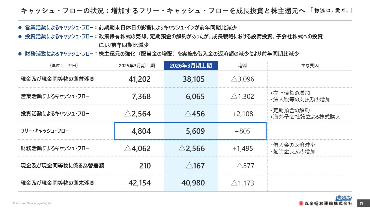 投資活動によるキャッシュ・フローでは、成長戦略における設備投資、海外子会社株式への投資によるキャッシュ・アウトがありましたが、政策保有株式の売却や定期預金の解約によるキャッシュ・インがあったため、全体として前年同期比でキャッシュ・アウトが減少しています。