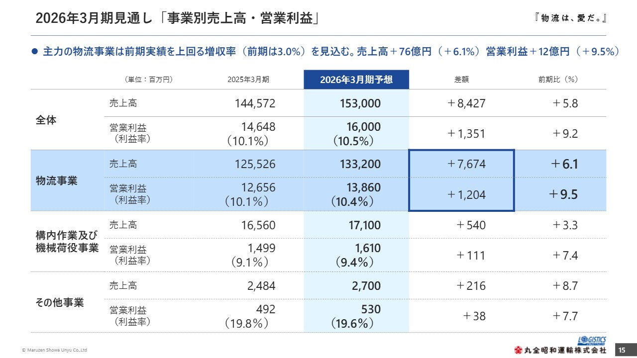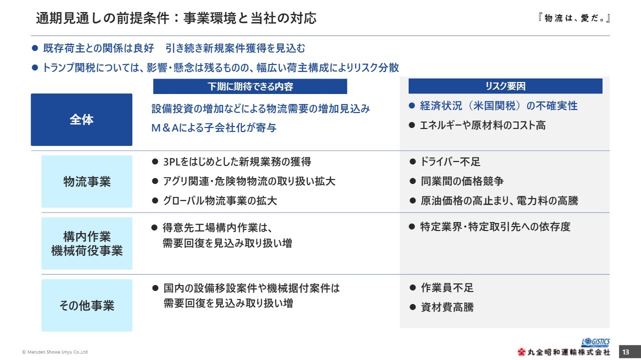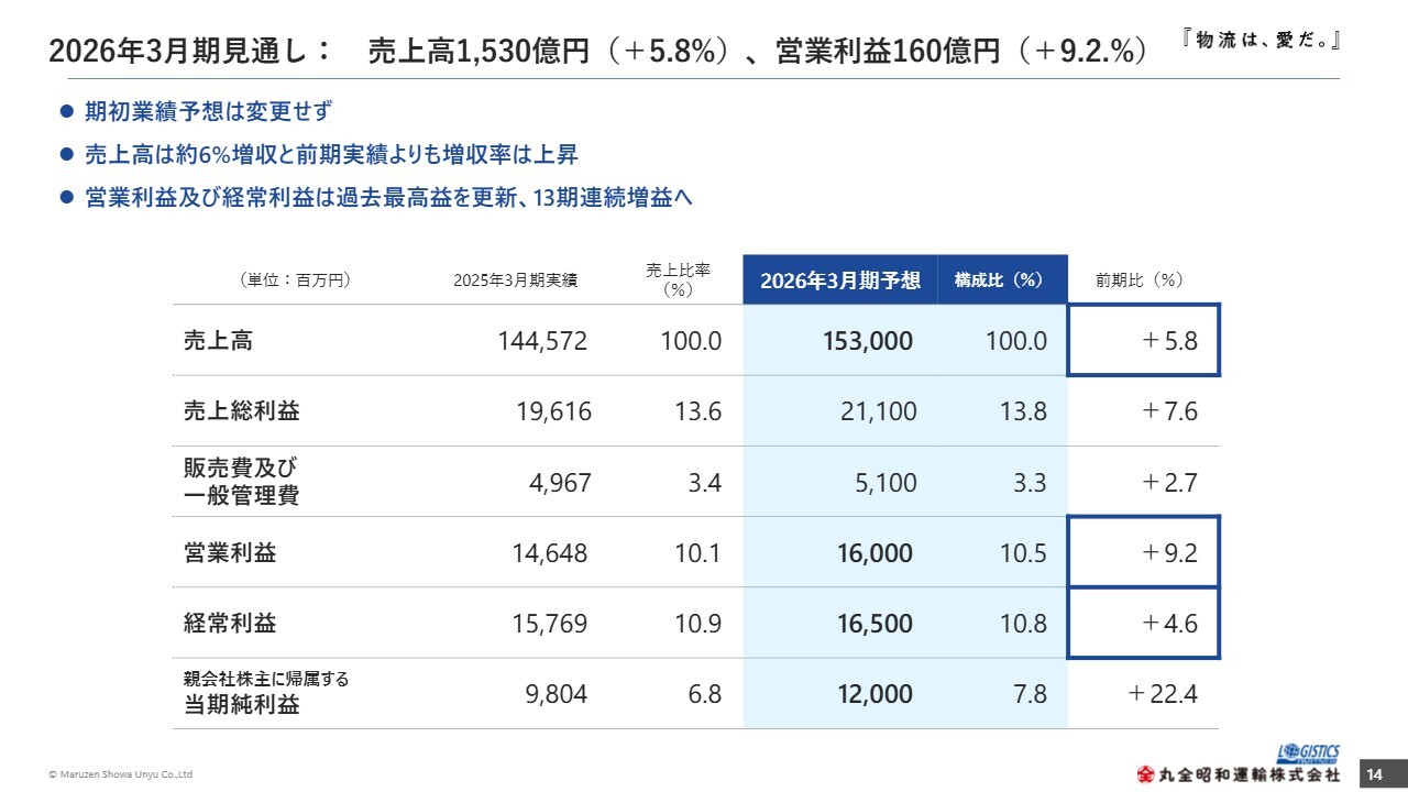 2026年3月期通期の見通しについてご説明します。当社の事業環境としては、既存荷主との関係は良好で、新規案件の獲得も引き続き見込まれます。