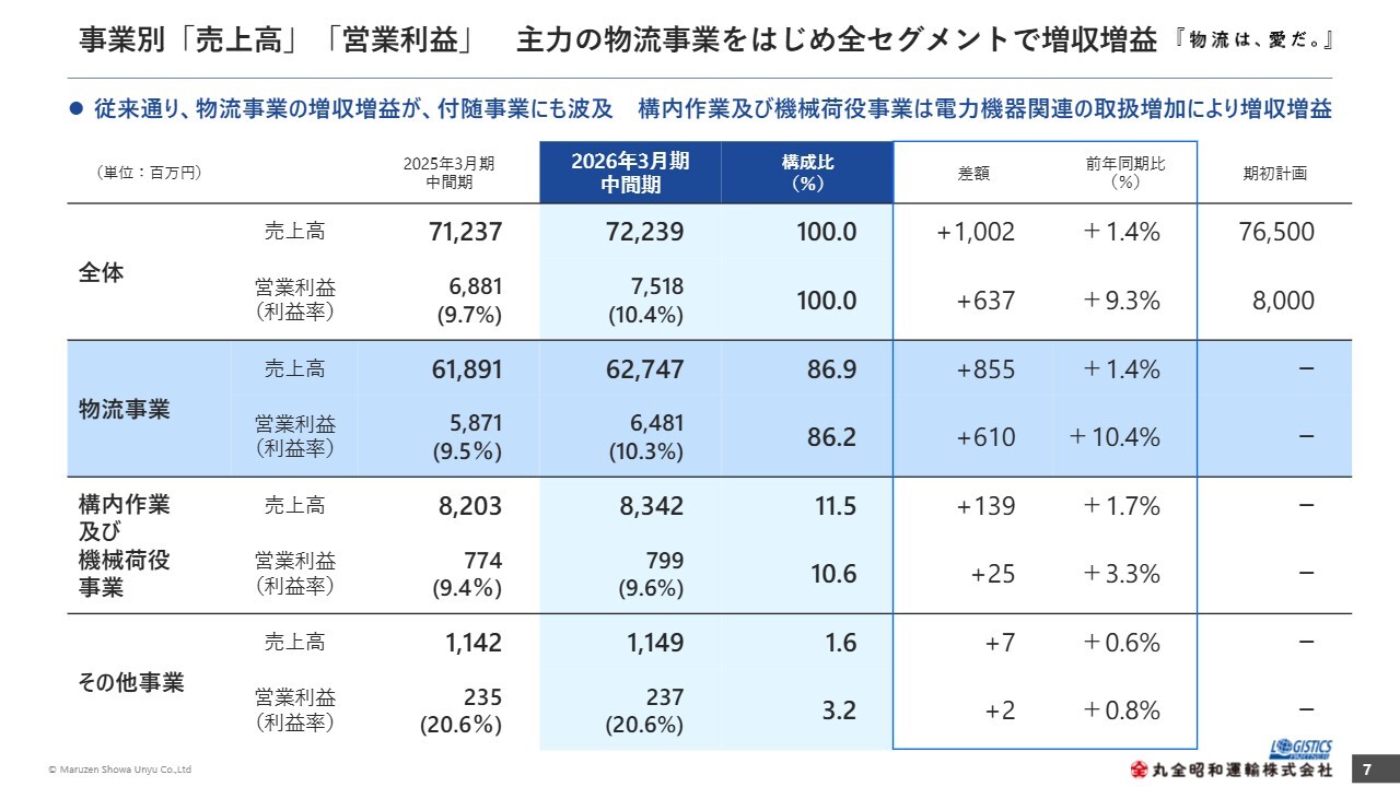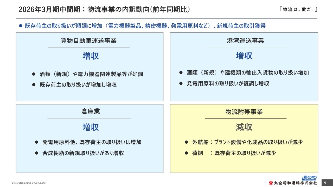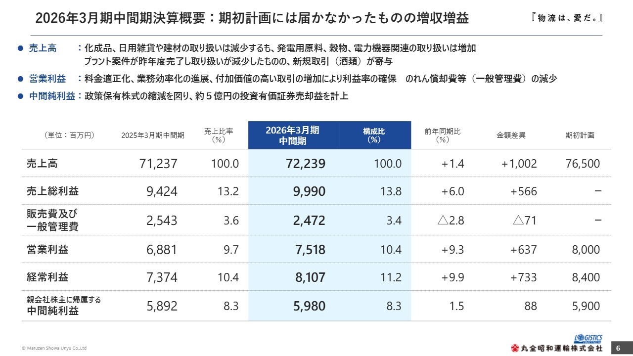 2026年3月期中間決算 ポイント:既存荷主中心に取引拡大、採算性改善で増収増益