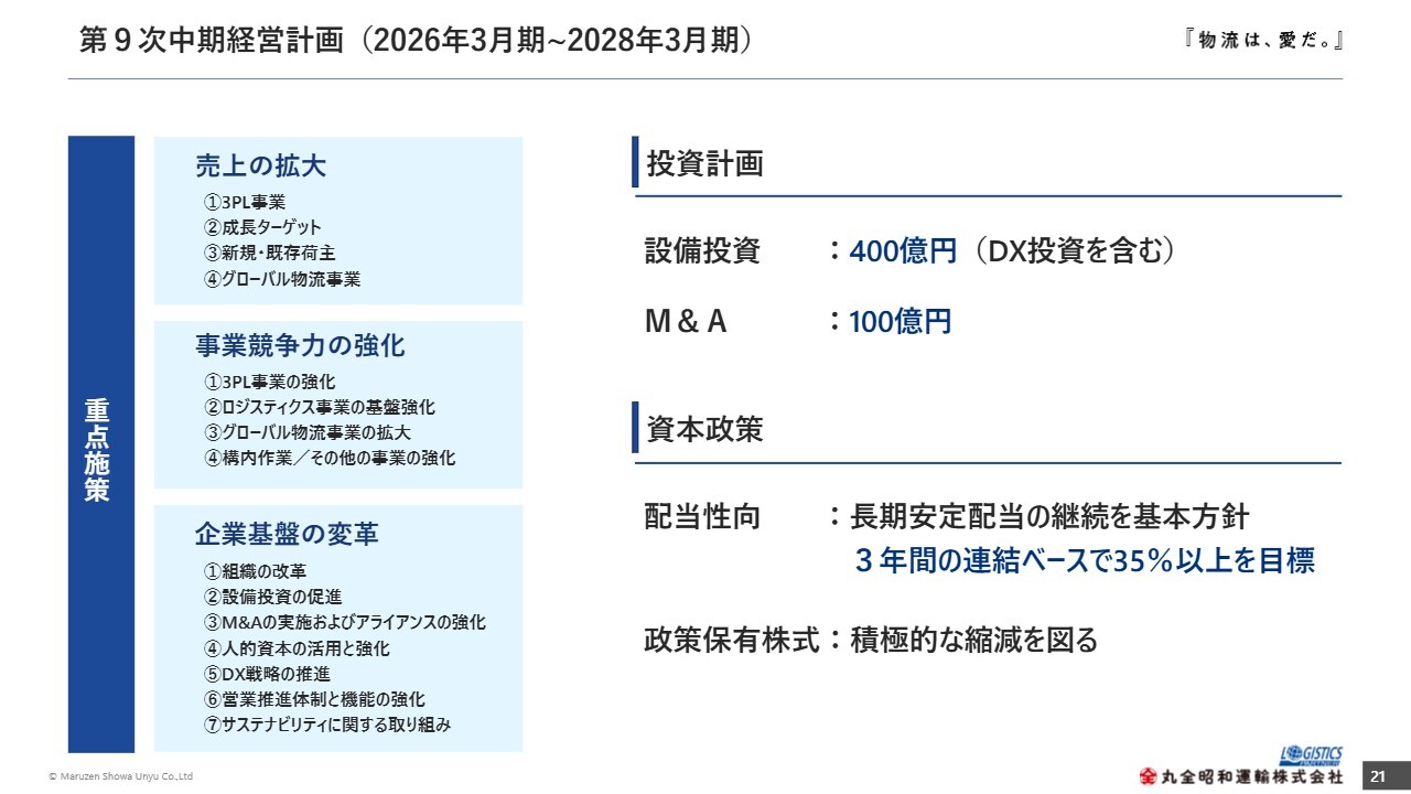 配当性向は、3年間の連結ベースで35パーセント以上を目標とします。政策保有株式は積極的に縮減を進めていきます。