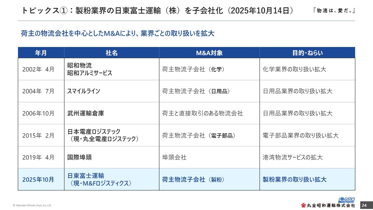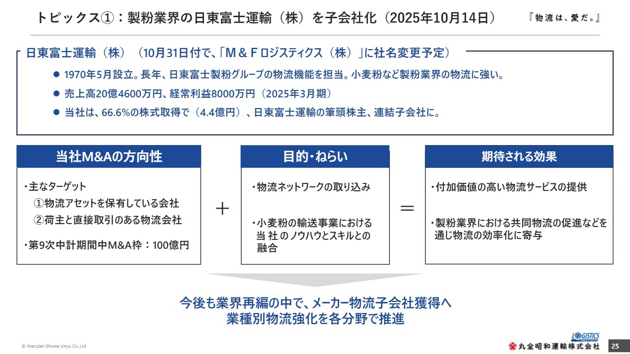 今回実施したM&Aの概要をご説明します。今年10月14日に、製粉業界の日東富士製粉グループの物流会社である日東富士運輸の株式を取得し、子会社化しました。そして、10月31日付でM&Fロジスティクスに社名変更しました。