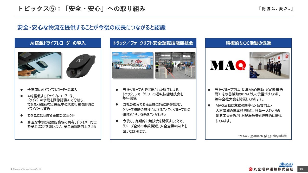 3つ目は、積極的なQC活動の促進です。当社では、いわゆるQC活動を「MAQ活動」と呼んでおり、長年にわたり活動を継続し、全社大会を毎年開催しています。