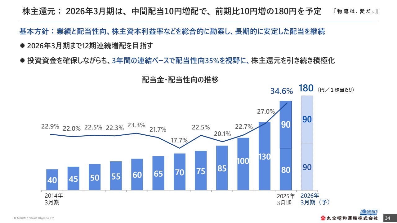2026年3月期については、すでに発表しているとおり、中間配当を90円とし、当初の予定から10円増配しています。現時点では、期末配当90円と合わせて、通期で180円となる予定です。今後は投資資金を確保しながらも、株主還元を積極的に進めていきたいと考えています。