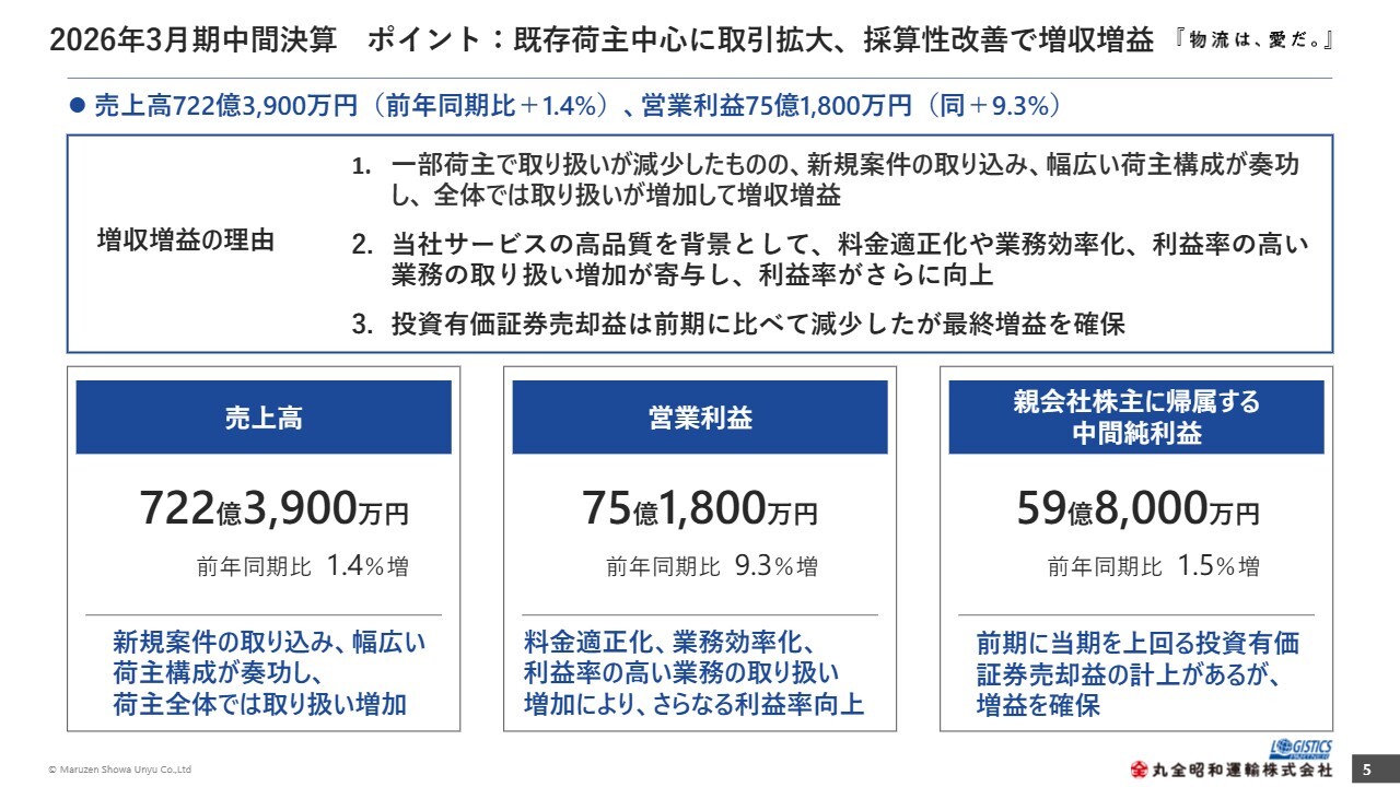 1つ目は、2026年3月期中間期決算の実績についてです。売上高は、一部荷主の取り扱いが減少したものの、新規案件の取り込みや幅広い荷主構成が奏功し、荷主全体では取り扱いが増加した結果、増収を達成しました。