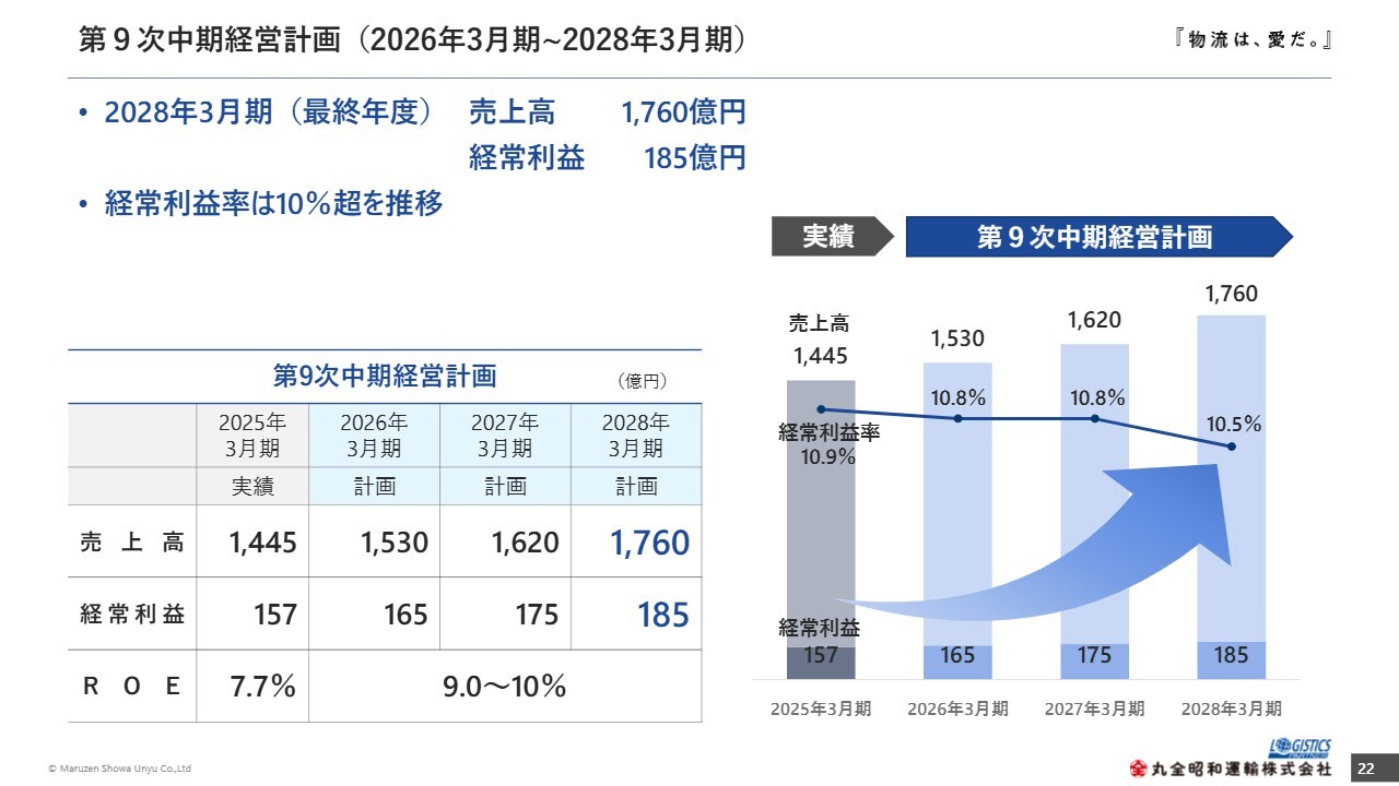 第9次中計の数値目標です。最終年度となる2028年3月期には、売上高1,760億円、経常利益185億円、ROE9パーセントから10パーセントを達成することを目指しています。