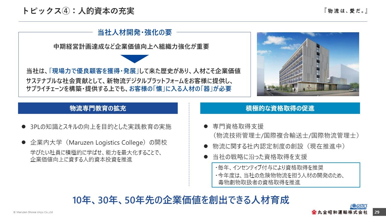 4つ目のトピックスは、人的資本の充実です。直近の取り組みとして、毎年指定された資格を取得した社員にインセンティブを付与することで、当社の戦略に沿った資格取得を支援しています。