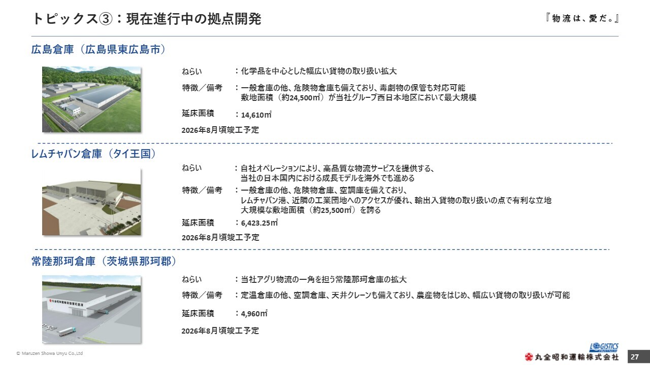1つ目が、広島県東広島市に建設中の広島倉庫です。敷地面積は2万4,500平方メートルと、西日本地区における当社グループの拠点としては最大規模となります。一般倉庫に加えて危険物倉庫も備えており、毒劇物の保管にも対応可能です。化学品を中心に幅広い貨物の取り扱いを拡大していく予定です。