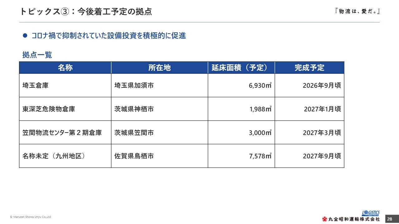 今後着工を予定している拠点についてです。コロナ禍で設備投資が抑制されていましたが、今後は積極的に設備投資を進めていきます。