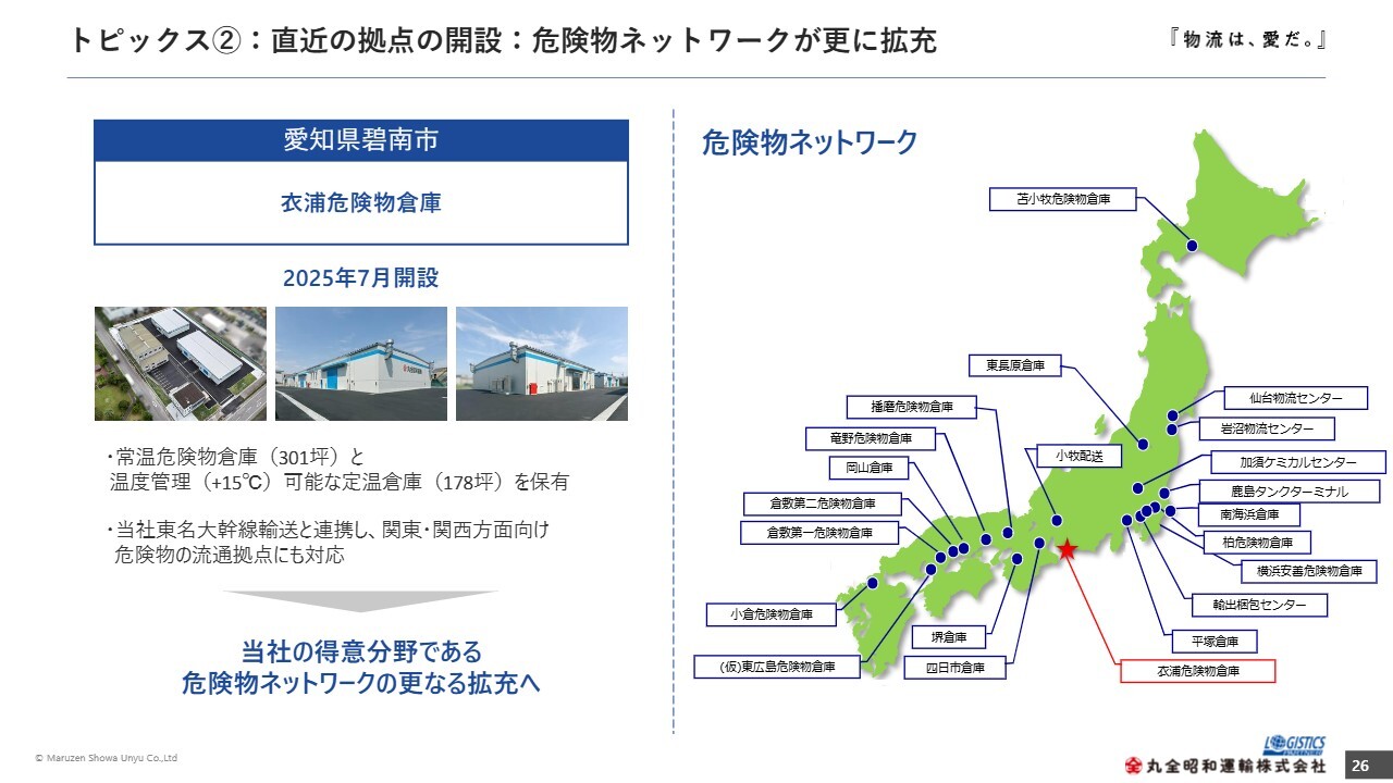 2つ目のトピックスとして、直近の拠点開設についてご説明します。今年7月、愛知県碧南市に衣浦危険物倉庫を開設しました。