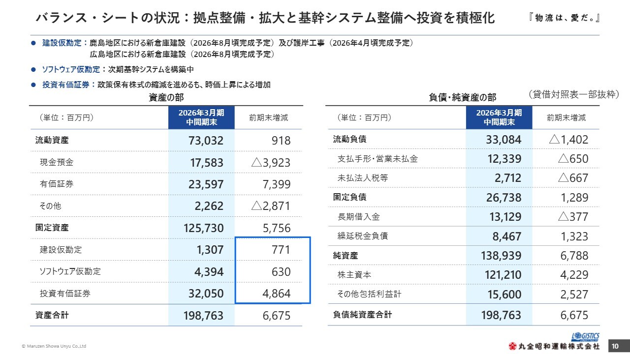 バランス・シートの状況です。固定資産において、建設仮勘定については、鹿島地区の新倉庫建設及び護岸工事、広島地区の新倉庫建設を進め、建設代金の一部支払いを計上しています。