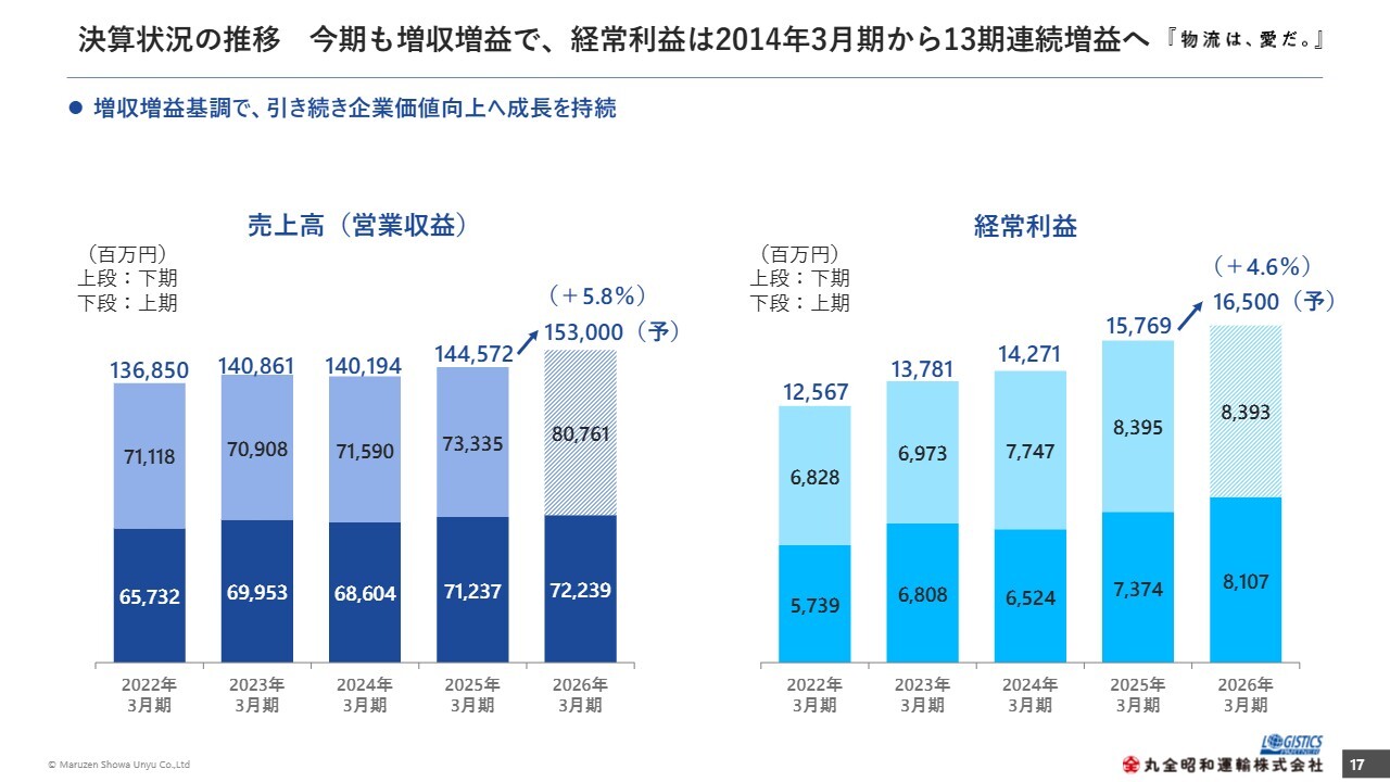 今期も増収増益を見込み、過去最高の売上高・利益を更新する見通しです。これが達成されれば、経常利益は13期連続で増益となります。