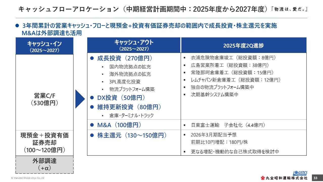 キャッシュ・アウトについては、物流拠点の拡充や3PLの高度化投資、物流プラットフォームの構築に270億円、DX投資に50億円、倉庫などの設備の維持更新投資に80億円を想定しています。
