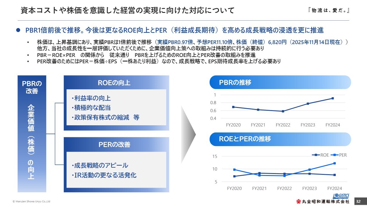 当社の株価は上昇傾向にあり、PBRは直近では1倍前後で推移しています。今後、当社の成長性をさらにご評価いただくため、引き続きROEの向上とPERの改善に向けた取り組みを行います。