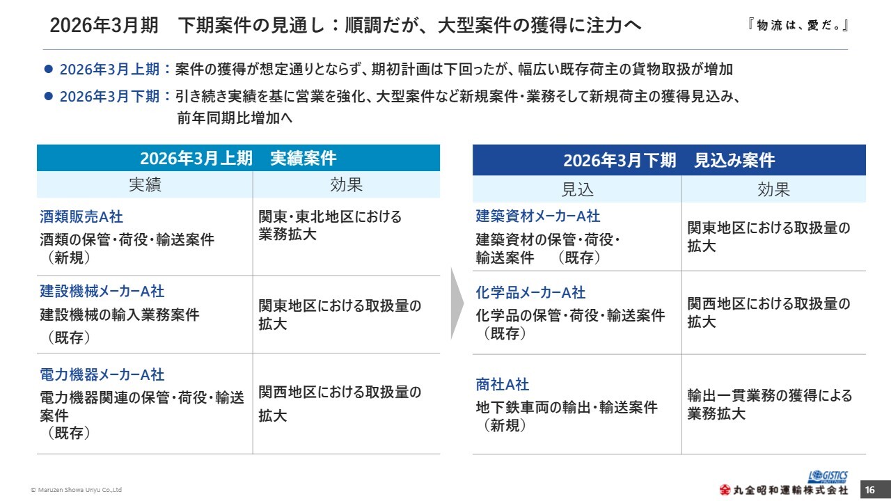 具体的な案件として、2026年3月期上期には、酒類販売会社の新規取り扱い、既存荷主である建設機械・電力機器のほか、食品の取り扱いが拡大しました。