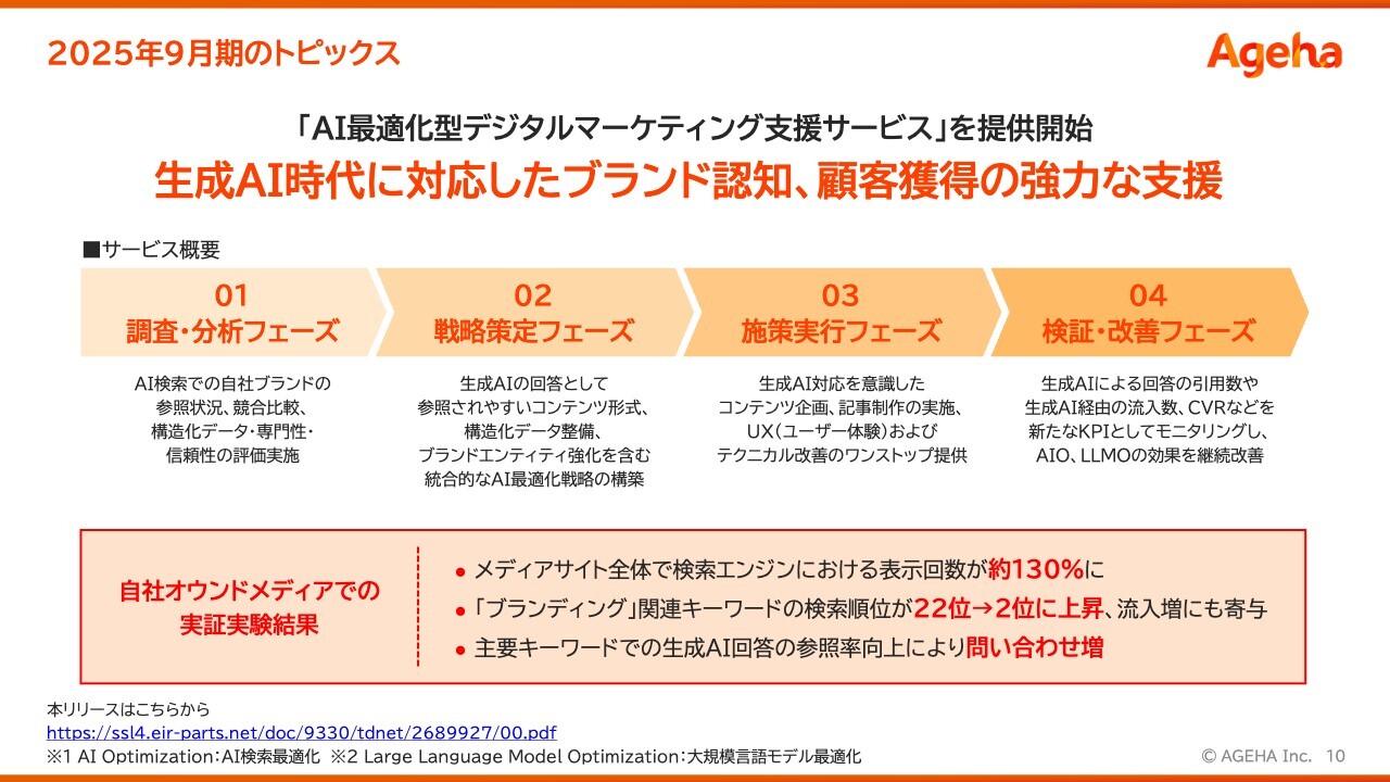 トピックスです。最近は、「AIで検索した際に社名が表示されるようにしてほしい」という依頼が数多く寄せられています。当社には早期から取り組んできたノウハウがあるため、それをクライアント向けにサービス化しました。結果は、これから現れてくると考えています。