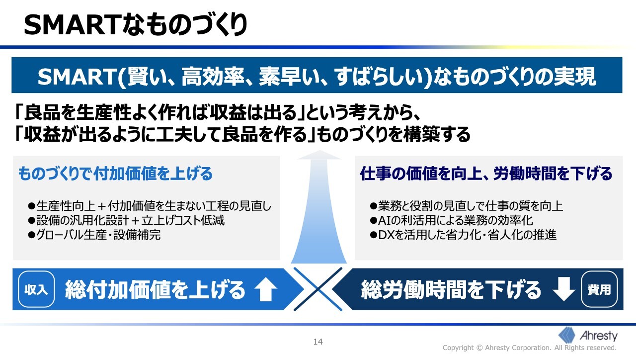 今年度よりスタートした2025年度から2027年度の中期経営計画では、「SMARTなものづくりの実現」を掲げ、生産活動に取り組んでいます。この活動は、「良品を生産性よく作れば収益は出る」という考えを一歩進化させ、「収益が出るように工夫して良品を作る」ものづくりを構築する取り組みです。