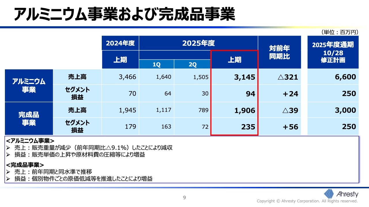 アルミニウム事業では、販売数量が前年同期比で約9パーセント減少したことにより減収となりました。ただし、販売単価の上昇や原材料費の圧縮により、損益は改善しています。