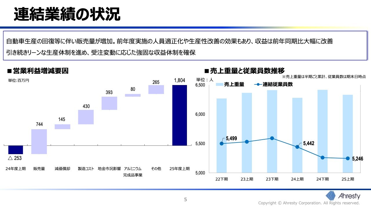 連結業績の内訳についてご説明します。営業利益は、前年同期の赤字から黒字へと大きく改善しました。主な要因は、販売量の増加、製造コストの低減、さらに前年度に収益を圧迫していた地金の市場価格の高騰が一定程度落ち着いたことによるものです。