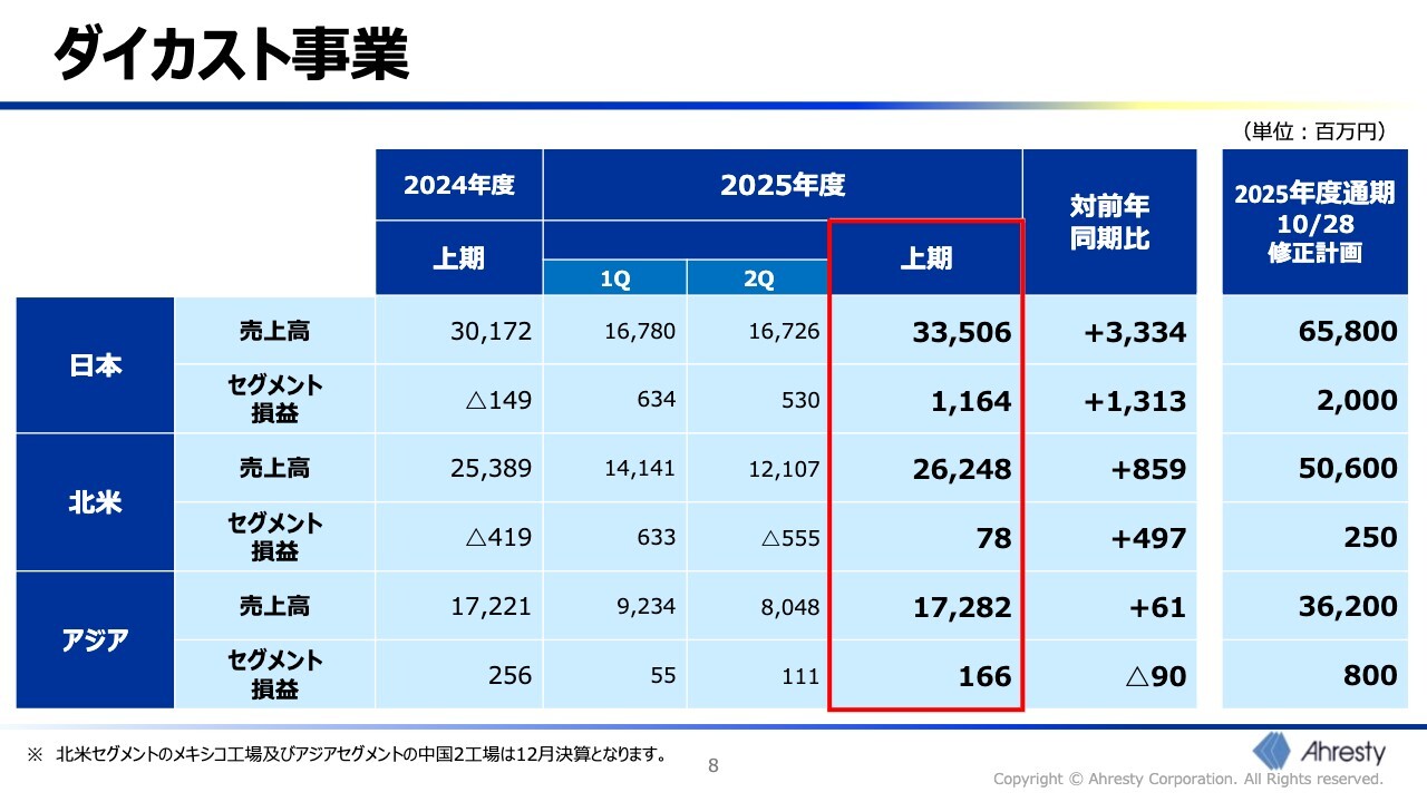 まず、ダイカスト事業のセグメント別の決算状況についてです。日本セグメントは増収増益となりました。前年度に人員体制の見直しを進めた結果、固定費負担が軽減され、さらに売上重量の増加が寄与したことで、前年同期比で収益水準が大幅に改善しました。上期の実績を受け、通期セグメントの利益予想も20億円と上方修正しました。