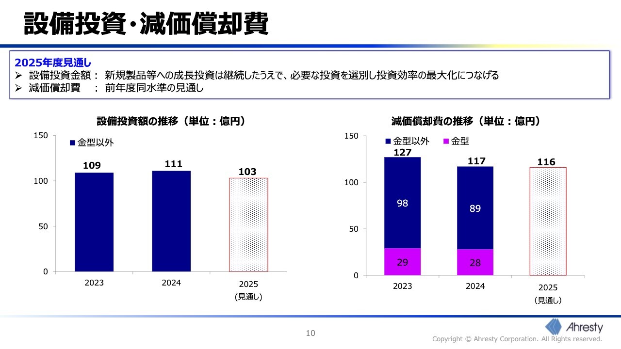 設備投資額の推移と減価償却費の見通しについてご説明します。今年度の設備投資は103億円となる見込みで、ほぼ前年並みの水準です。新規製品への成長投資を継続しながらも、必要な投資を選別し、投資効率の最大化を目指しています。