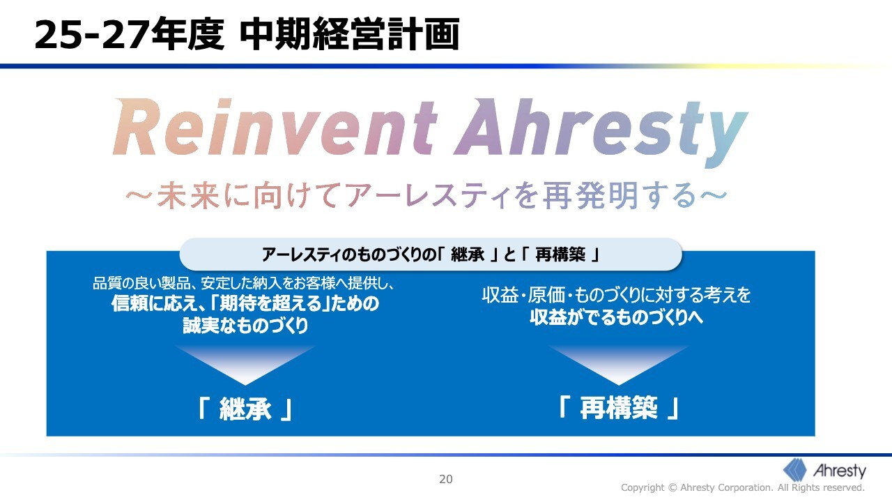 高橋:2025年度から2027年度までの中期経営計画「Reinvent Ahresty」についてご説明します。「Reinvent Ahresty」の基本方針は、アーレスティのものづくりの「継承」と「再構築」です。
