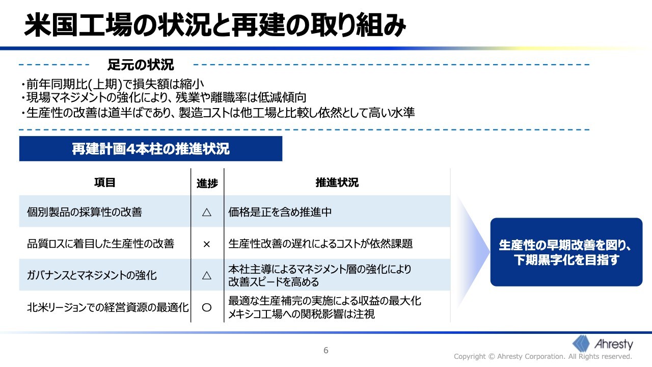 これら4本柱を加速させることで、米国工場の収益構造を抜本的に立て直し、下期の黒字化を目指します。