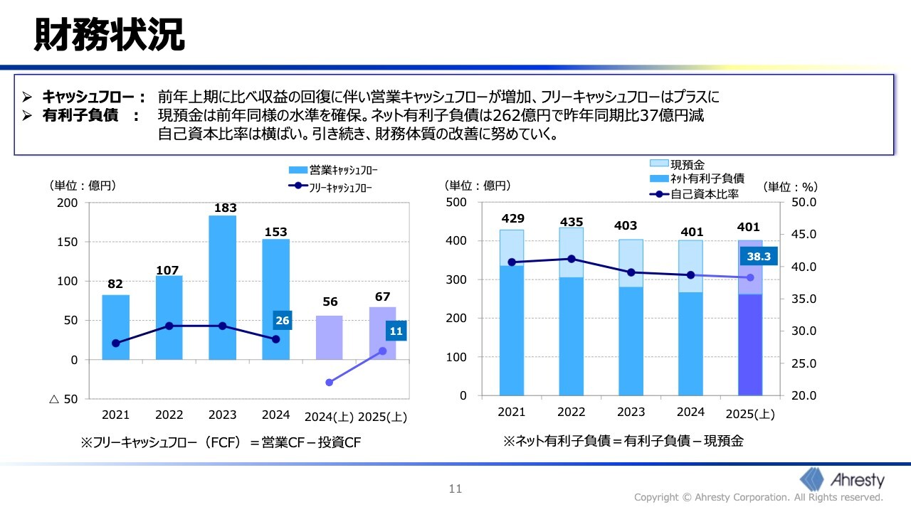 キャッシュフローと有利子負債の状況についてです。2025年度上期は稼ぐ力が大きく改善したことにより、営業キャッシュフローが増加し、フリーキャッシュフローもプラスを維持しています。